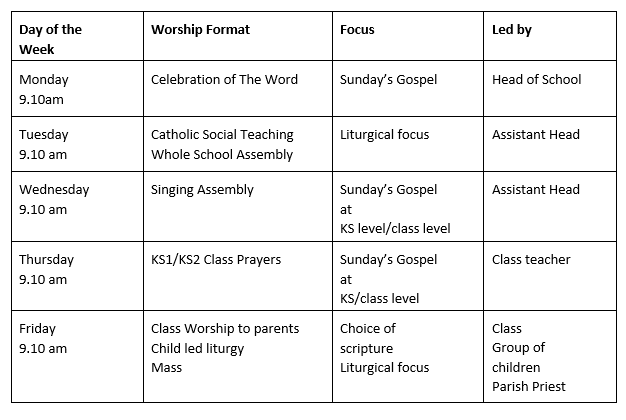 Every other Friday, the whole school community comes together for a time of collective worship. We celebrate the achievements of the school, awards are presented and one child in each class is chosen to receive the Values Cross. We end the week together by praying the end-of-day prayer and thanking God for all He has helped us to achieve that week.